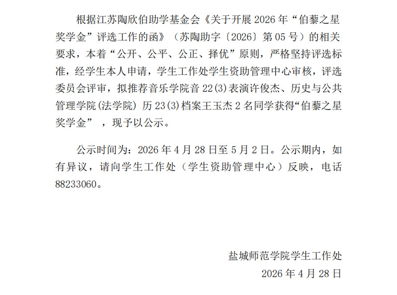 盐城师范学院2026年“伯藜之星奖学金”评审结果公示